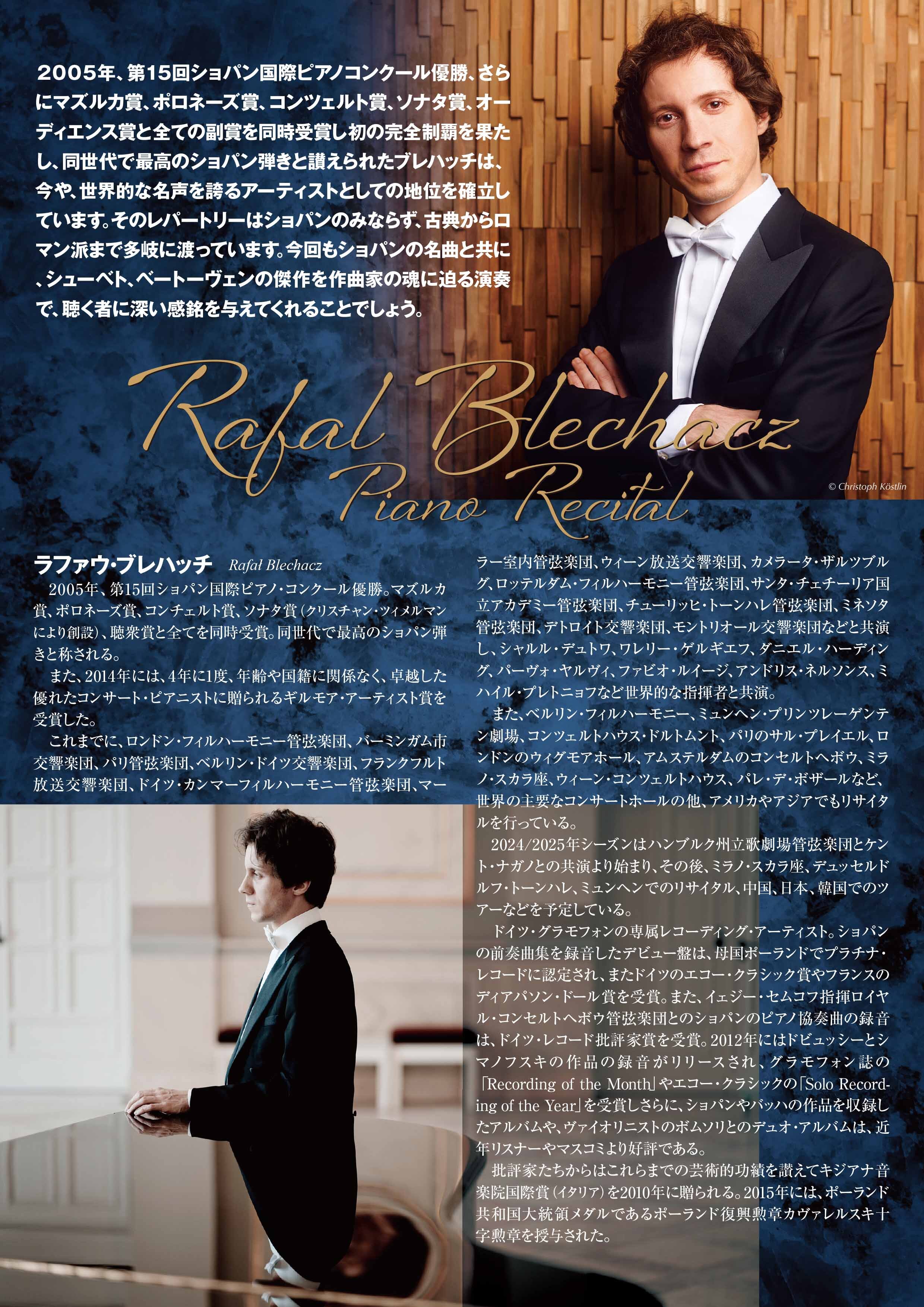 2005年、第15回ショパン国際ピアノ・コンクール優勝、さらにマズルカ賞、ポロネーズ賞、コンツェルト賞、ソナタ賞、オーディエンス賞と全ての副賞を同時受賞し初の完全制覇を果たし、同世代で最高のショパン弾きと讃えられたブレハッチは、今や、世界的な名声を誇るアーティストとしての地位を確立しています。そのレパートリーはショパンのみならず、古典からロマン派まで多岐に渡っています。今回もショパンの名曲と共に、シューベト、ベートーヴェンの傑作を作曲家の魂に迫る演奏で、聴く者に深い感銘を与えてくれることでしょう。