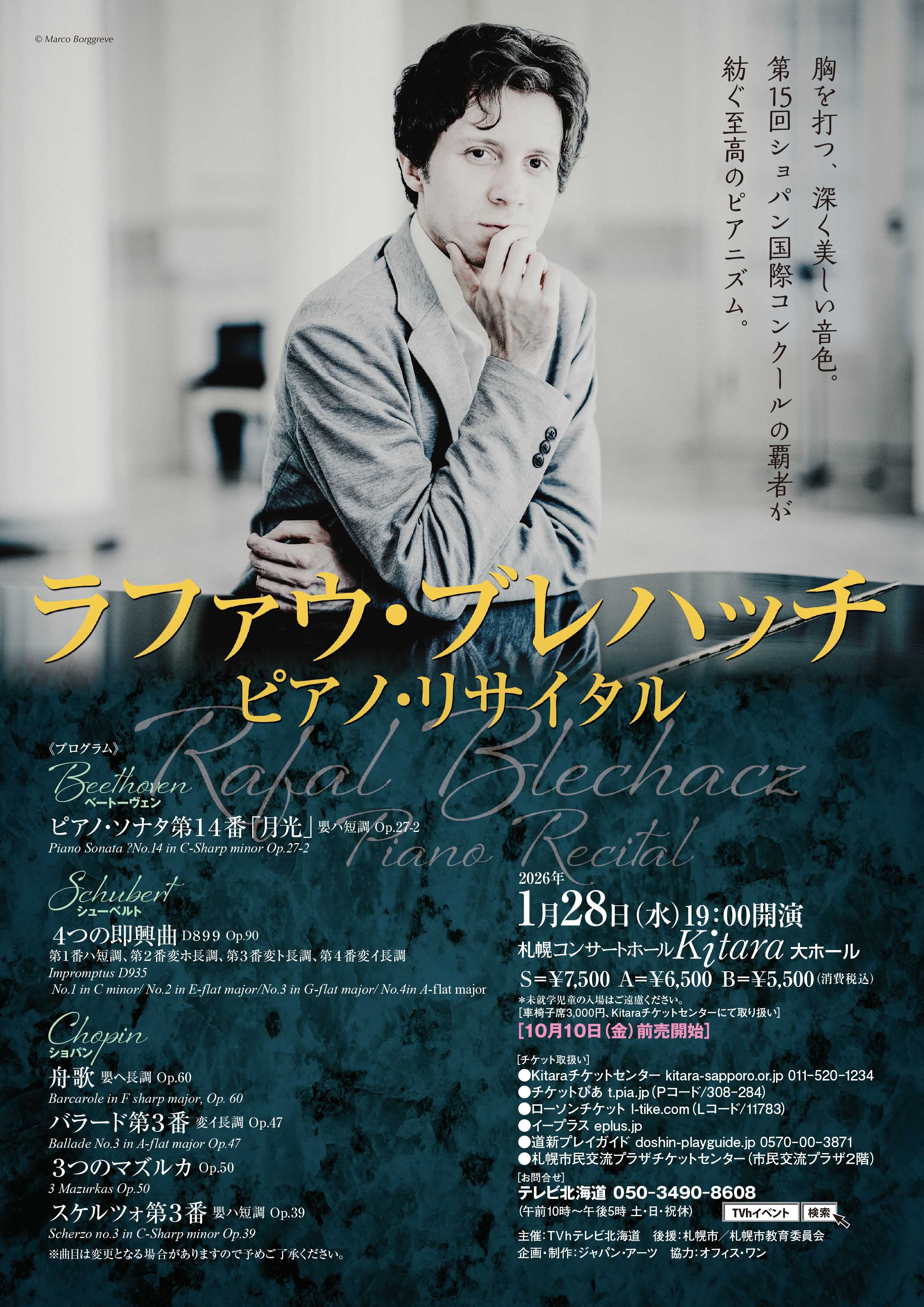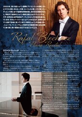 ラファウ・ブレハッチ ピアノ・リサイタル RafaI Blechacz Piano Recital 《プログラム》 Beethovenベートーヴェン ピアノ・ソナタ第14番「月光」 嬰ハ短調 Op.27-2 Piano Sonata No.14 in C-Sharp minor Op.27-2 Schubert シューベルト 4つの即興曲 D899 Op.90 第1番ハ短調、第2番変ホ長調、第3番変ト長調、第4番変イ長調 Impromptus D935 No.1 in C minor/ No.2 in E-flat major/No.3 in G-flat major/ No.4in A-flat major Chopinショパン 舟歌 嬰ヘ長調 Op.60 Barcarole in F sharp major, Op. 60 バラード第3番変イ長調 Op.47 Ballade No.3 in A-flat major Op.47 3つのマズルカ Op.50 3 Mazurkas Op.50 スケルツォ 第3番 嬰ハ短調 Op.39 Scherzo no.3 in C-Sharp minor Op.39 ※演奏曲目・曲順等は変更になる場合がございます。