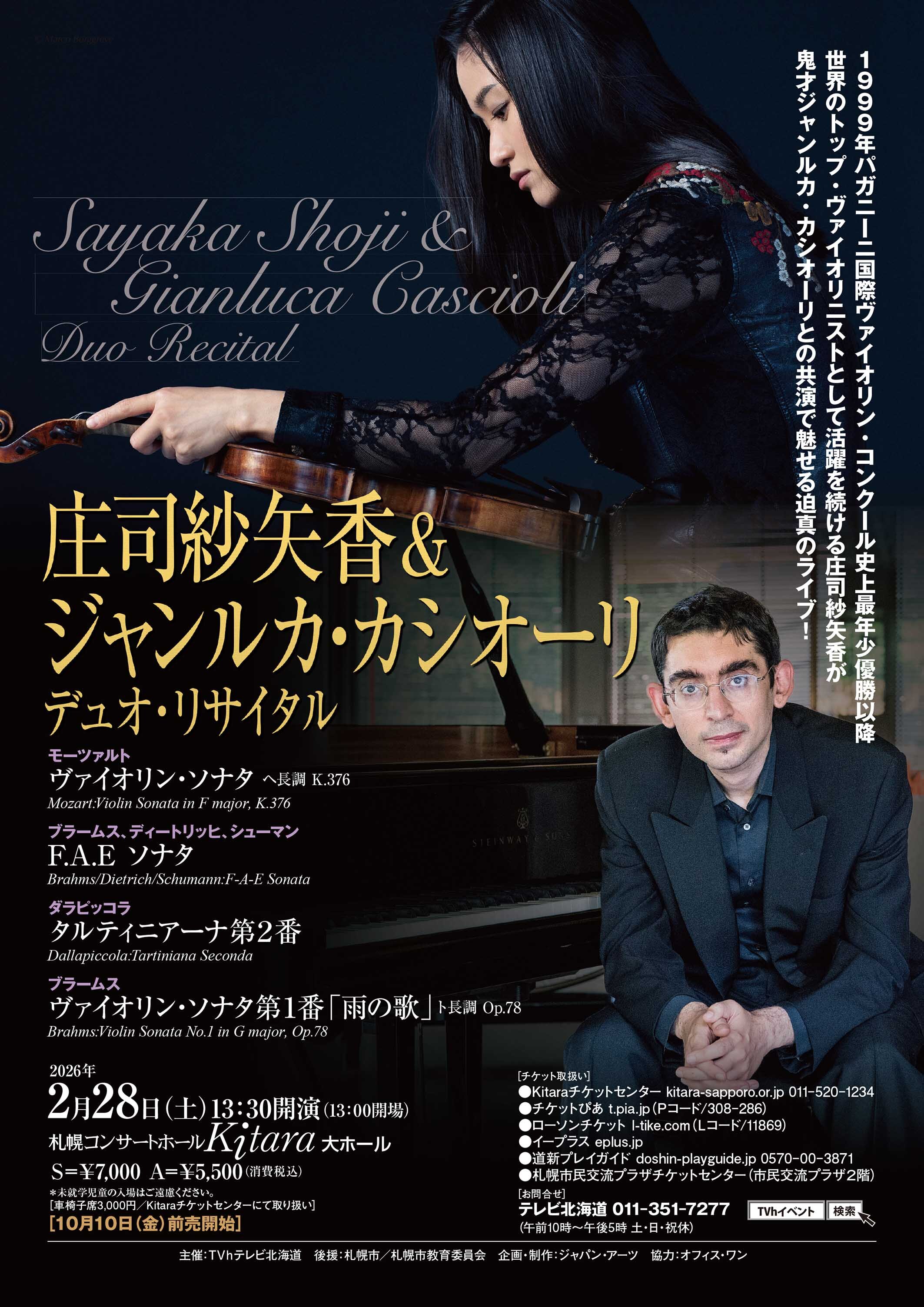 【Program】 モーツァルト:ヴァイオリン・ソナタ ヘ長調 K.376 Mozart:Violin Sonata in F major, K.376 ブラームス、ディートリッヒ、シューマン:F.A.E ソナタ Brahms/Dietrich/Schumann:F-A-E Sonata ダラピッコラ:タルティニアーナ第2番 Dallapiccola: Tartiniana Seconda ブラームス:ヴァイオリン・ソナタ第1番「雨の歌」ト長調 Op.78 Brahms:Violin Sonata No.1 in G major, Op.78 庄司紗矢香 (ヴァイオリン) Sayaka Shoji, Violin 唯一無二の芸術的多様性とレパートリーへの緻密なアプローチで、国際的に認められるヴァイオリニスト。 その音楽的言語に対する非凡な洞察力は、これまで拠点を持ってきたヨーロッパと日本、二つの背景の混合に由来する。 東京に生まれ、3歳でイタリアのシエナに移住。キジアーナ音楽院とケルン音楽大学で学び、14歳でルツェルン音楽祭にて、ルドルフ・バウムガルトナー指揮ルツェルン祝祭管弦楽団との共演でヨーロッパ・デビュー、及びウィーン楽友協会に出演した。 1999年、パガニーニ国際コンクールにて史上最年少優勝。以来、ズービン・メータ、ロリン・マゼール、セミョン・ビシュコフ、マリス・ヤンソンス、ユーリ・テミルカーノフなど多数の一流指揮者と共演を重ねた。これまでに共演したオーケストラはイスラエル・フィル、フィルハーモニア管、クリーヴランド管、ロンドン響、ベルリン・フィル、ロサンゼルス・フィル、ニューヨーク・フィル、聖チェチーリア国立アカデミー管、チェコ・フィル、マリインスキー管、NHK響など多数。 2024/25年シーズンのハイライトには、エサ=ペッカ・サロネン指揮サンフランシスコ響、カーチュン・ウォン指揮クリーヴランド管、ヤープ・ファン・ズヴェーデン指揮エバーグリーン響、トンキュンストラー管、シュトゥットガルト室内管とのコンサートが挙げられる。2024年秋にはアラン・アルティノグル(首席指揮者)とフランクフルト放送響の日本ツアーに参加。その名演が評価され、2025年に第37回ミュージック・ペンクラブ音楽賞を受賞した。 室内楽では、ジャンルカ・カシオーリとの15年にわたる共演のほか、モディリアーニ・カルテット、ベンジャミン・グロスヴェナー、ベアトリス・ラナ、キアン・ソルタニ、スティーヴン・イッサーリス、スティーヴン・コヴァチェヴィッチ、ヴィキングール・オラフソンなど、多くのアーティストと長年にわたって共演しており、フィルハーモニー・ド・パリ、ウィグモアホール、サントリーホール、ハンブルク・ライツハレなどで定期的にリサイタルを行っている。 庄司紗矢香はまた、多様な芸術分野とのコラボレーションでも世界的に高く評価されている。 舞踊家・振付家の勅使河原三郎とのフィルハーモニー・ド・パリでの共演のほか、安藤忠雄、杉本博司らとも精力的にコラボレーションを行っている。 2007年に創作した実験的な視覚音楽プロジェクト「Synesthesia」は、2014年のグループ展覧会“Au-delà de mes rêves”で、草間彌生、ソフィ・カル等の著名な芸術家たちと並び選ばれた。 これまでドイツ・グラモフォンから、ユーリ・テミルカーノフ指揮サンクトペテルブルク・フィルとの録音や、メナヘム・プレスラーとのリサイタル・アルバムなどを含む11枚のアルバムをリリース。2022年と2025年には、ジャンルカ・カシオーリとのモーツァルト:ヴァイオリン・ソナタのアルバムをリリースした。 2016年、芸術分野で顕著な影響を及ぼした者に与えられる「毎日芸術賞」を受賞。2012年には日経ビジネスの「次世代を創る100人」に選出。 使用楽器は上野製薬株式会社より貸与されているストラディヴァリウス「レカミエ」1729年製。 ジャンルカ・カシオーリ ( ピアニスト/作曲家/指揮者) Gianluca Cascioli , Pianist/Composer/Conductor 1979年イタリアのトリノ生まれ。ピアノをイモラのピアノ・アカデミーでフランコ・スカラ(カルロ・ゼッキの教え子)に師事。94年ルチアーノ・ベリオ、エリオット・カーター、マウリツィオ・ポリーニ、チャールズ・ローゼンが審査員を務めたウンベルト・ミケーリ国際ピアノ・コンクールで優勝し、国際的な注目を集めた。 以来ヨーロッパ、北米、日本の主要な音楽都市に演奏の場を広げている。ベルリン・フィルハーモニー管弦楽団、ボストン交響楽団、シカゴ交響楽団、ニューヨーク・フィルハーモニック、ロスアンゼルス・フィル、ウィーン・フィルハーモニー管弦楽団、ロンドン・フィルハーモニー管弦楽団、ミラノ・スカラ座フィルハーモニー管弦楽団など著名なオーケストラと、クラウディオ・アバド、ウラディミール・アシュケナージ、チョン・ミョンフン、ダニエル・ハーディング、リッカルド・ムーティ、ロリン・マゼール、ズービン・メータ、ユーリ・テミルカーノフなど名だたる指揮者との共演は数えきれない。また、ムスティスラフ・ロストロポーヴィチ、ユーリ・バシュメット、マキシム・ヴェンゲーロフ、フランク・ペーター・ツィマーマン、クレメンス・ハーゲン、ザビーネ・マイヤー、アルバンベ